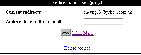 另外,當用戶不是以Postmaster身份登入qmailadmin 其權限只能更改該戶口的設定,包括轉寄、回覆和本戶的密碼。而該模式中有一個新增功能,名為"show redirect"。其實這個功能,即是轉寄。